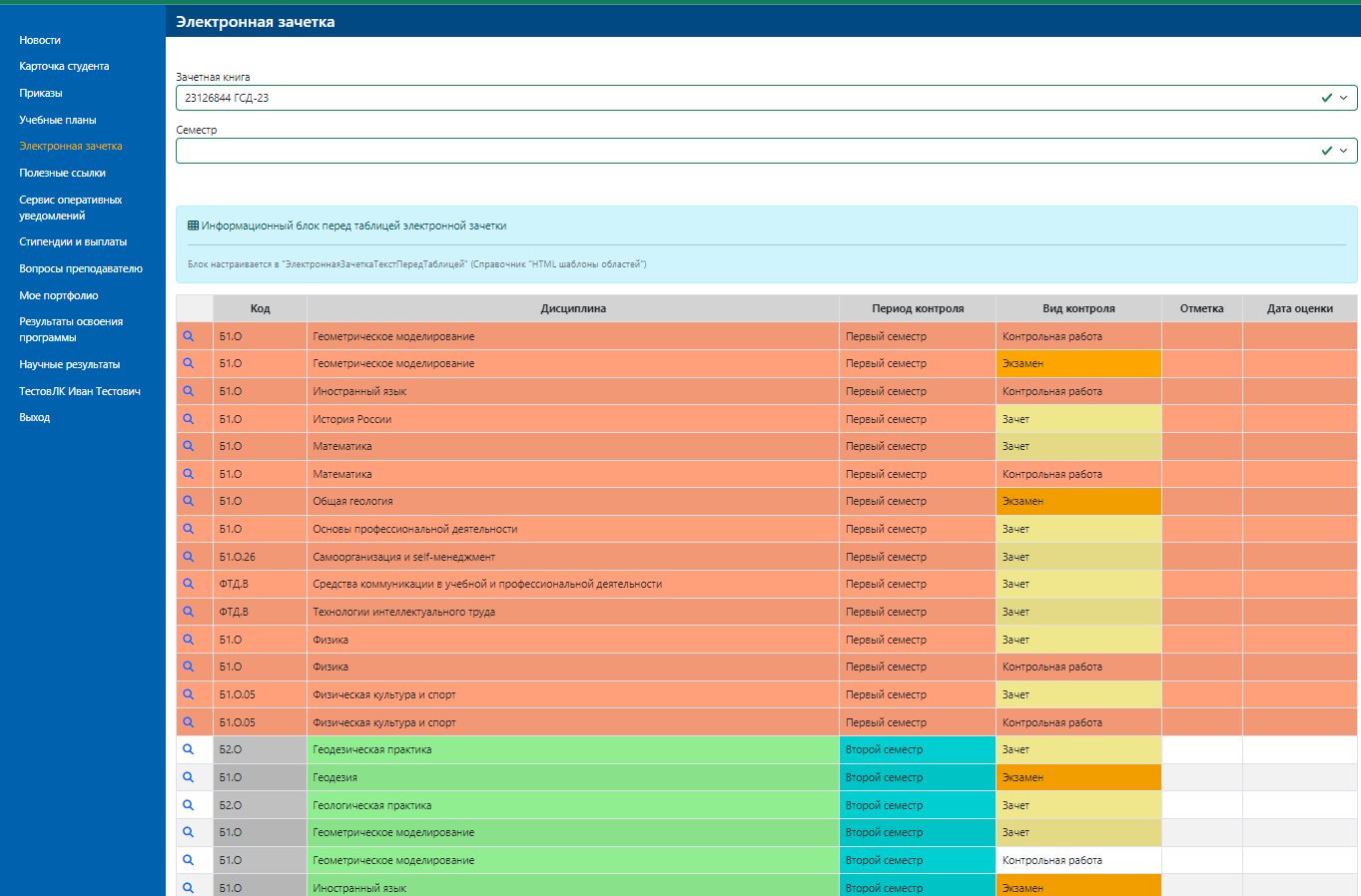 - Выделение позиций по экзаменам и зачетам разными цветами.