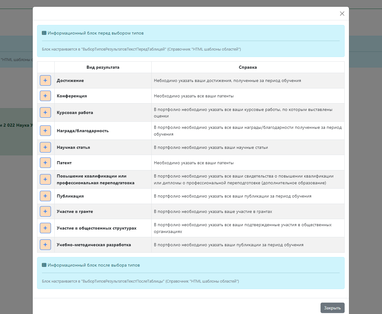 Форма списка форм настройки ввода результатов портфолио/научных достижений