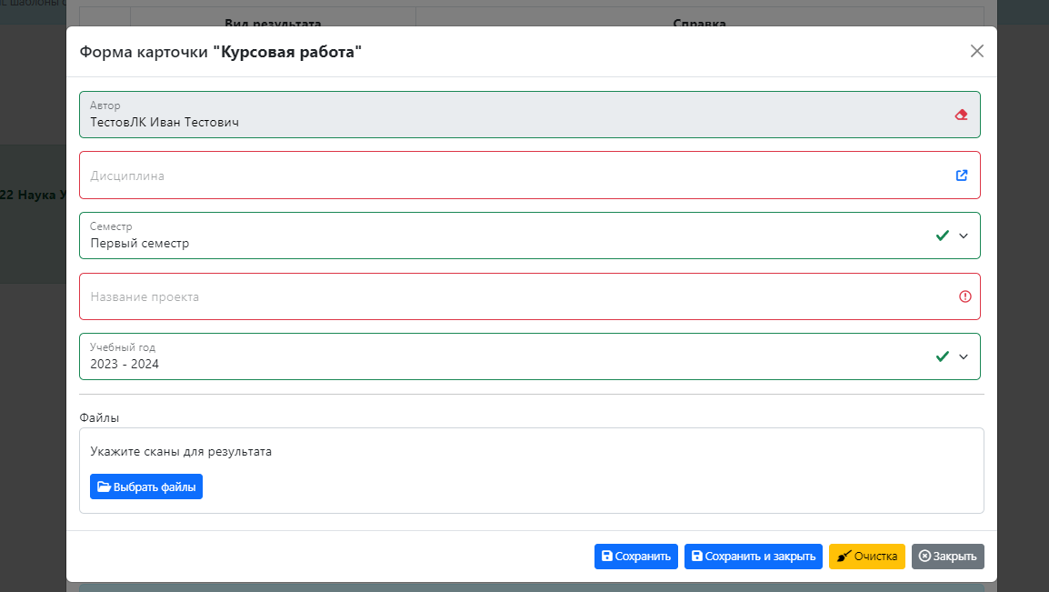 Форма настройки ввода результатов портфолио/научных достижений
