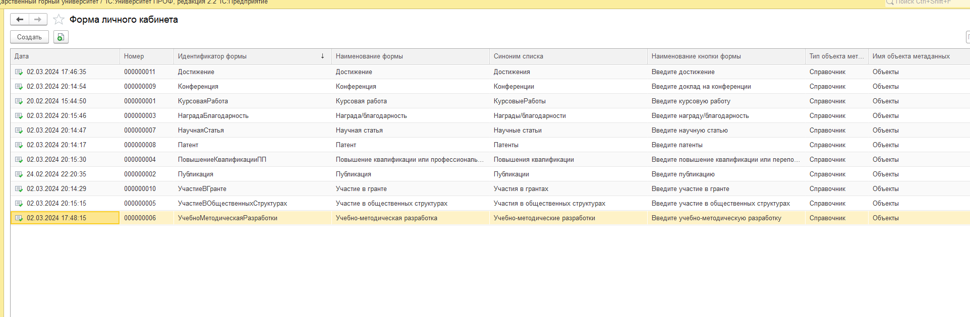 - Механизм настройки результатов портфолио/научных достижений основан на универсальном механизме справочника Объекты (1С:Университет ПРОФ)