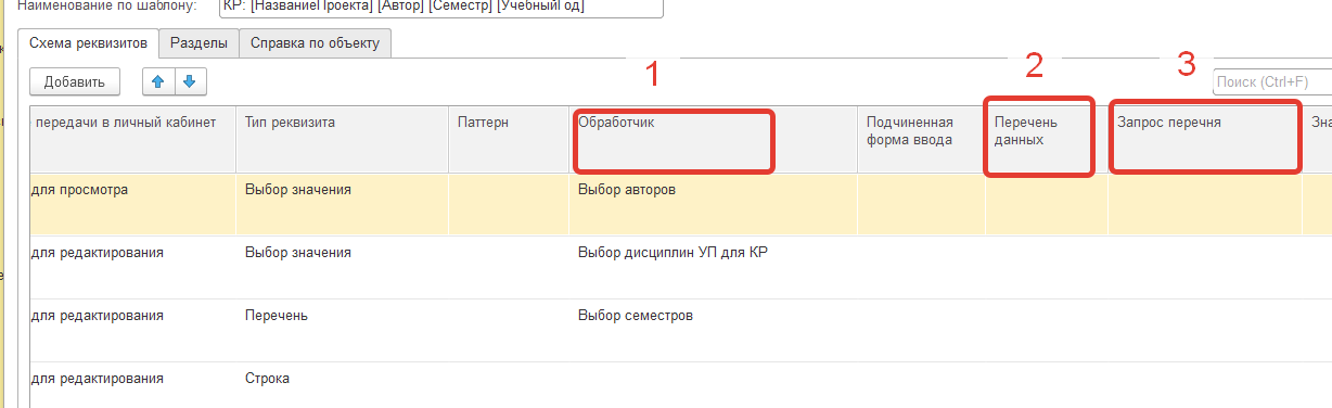 - для реквизитов типа Выбор значения необходимо настроить Обработчик, содержащий логику выбора данных из информационной базы