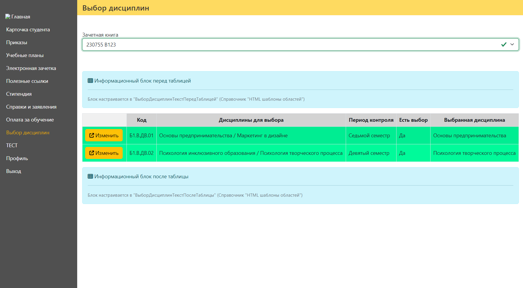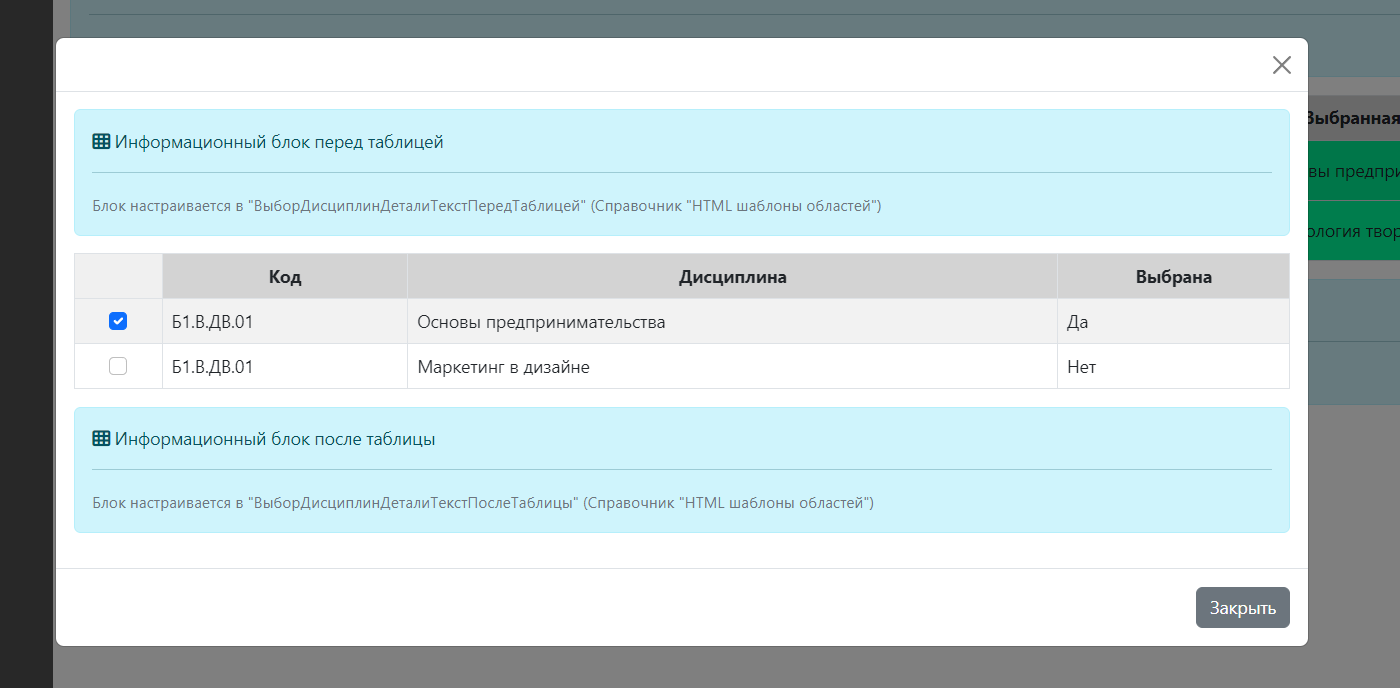- Шаблон перед таблицей детального выбора дисциплин
